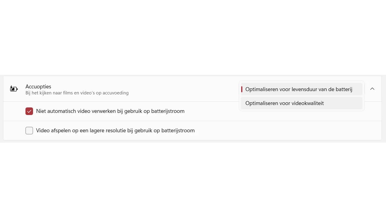 Wanneer je de verbeterde videoweergave uitgeschakeld laat, verschijnen extra Accu-opties. Hiermee kun je energie besparen door de resolutie te verlagen wanneer je laptop op batterij draait. Je hebt twee keuzes: Optimaliseren voor levensduur van de batterij en Optimaliseren voor videokwaliteit. Kies de tweede optie als beeldkwaliteit voor jou op dat moment belangrijker is dan een langere accuduur.