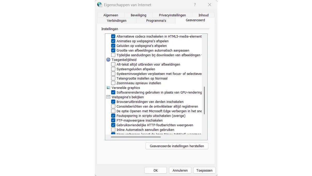 Heb je enkel problemen met het streamen van online video's, dan kan het inschakelen van software-rendering helpen. Dit is vooral nuttig wanneer de gpu van je pc wat verouderd is. Open het Configuratiescherm via het Startmenu en klik op Netwerkcentrum. Helemaal in de linkerbenedenhoek klik je op Internetopties. Hierdoor opent het dialoogvenster Eigenschappen van Internet. Selecteer het tabblad Geavanceerd. Scrol naar beneden tot je bij het onderdeel Versnelde graphics komt. Vink hier het vakje Software-rendering gebruiken in plaats van GPU-rendering aan. Klik op OK om de wijziging te bevestigen.
