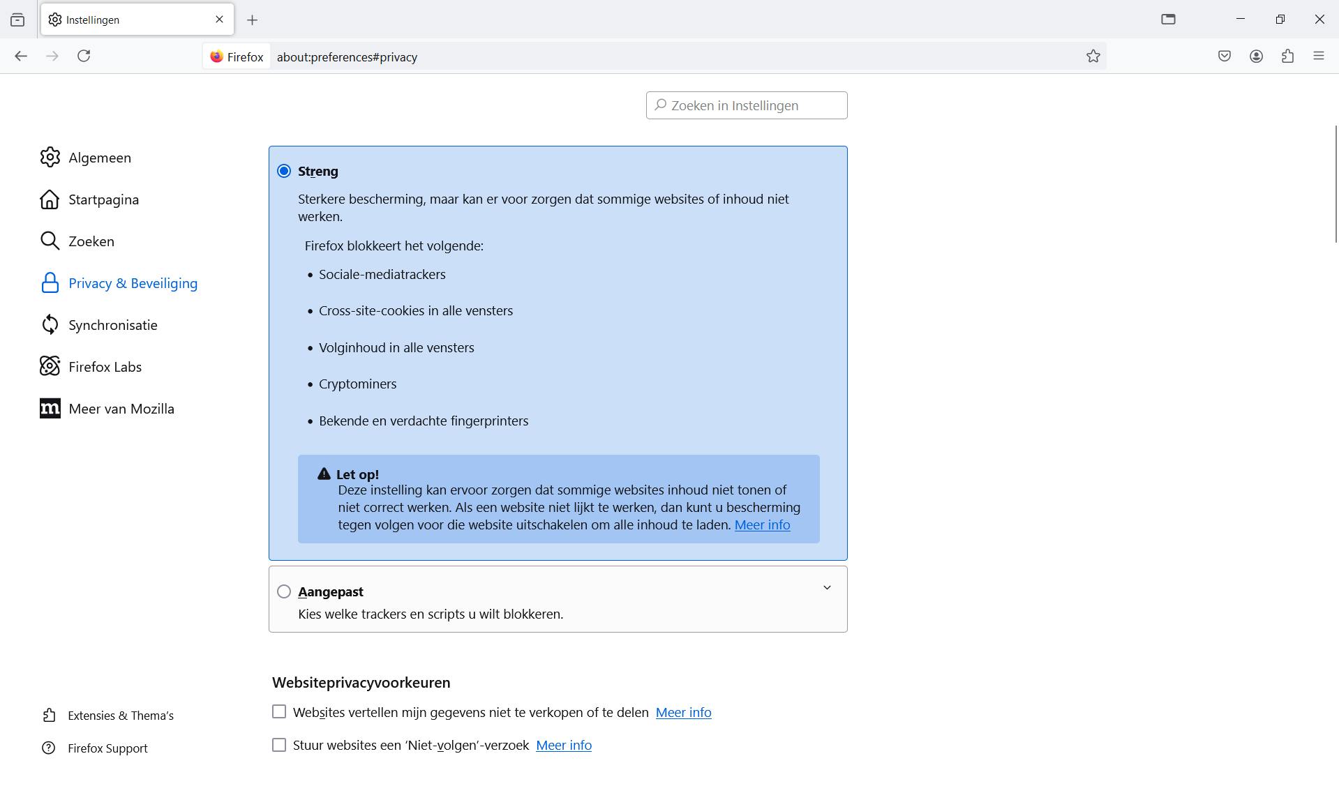De browser biedt daarnaast gedeeltelijke bescherming tegen onzichtbare trackers en fingerprinting. Firefox doet dat op basis van filterlijsten: zodra een script bekend is, wordt hij op de lijst geplaatst en automatisch geblokkeerd. Onbekende trackers en fingerprints worden dus nog wel doorgelaten. Tot slot verzamelt Firefox standaard telemetriegegevens, maar dat kun je wel grotendeels uitschakelen in de privacyinstellingen.
