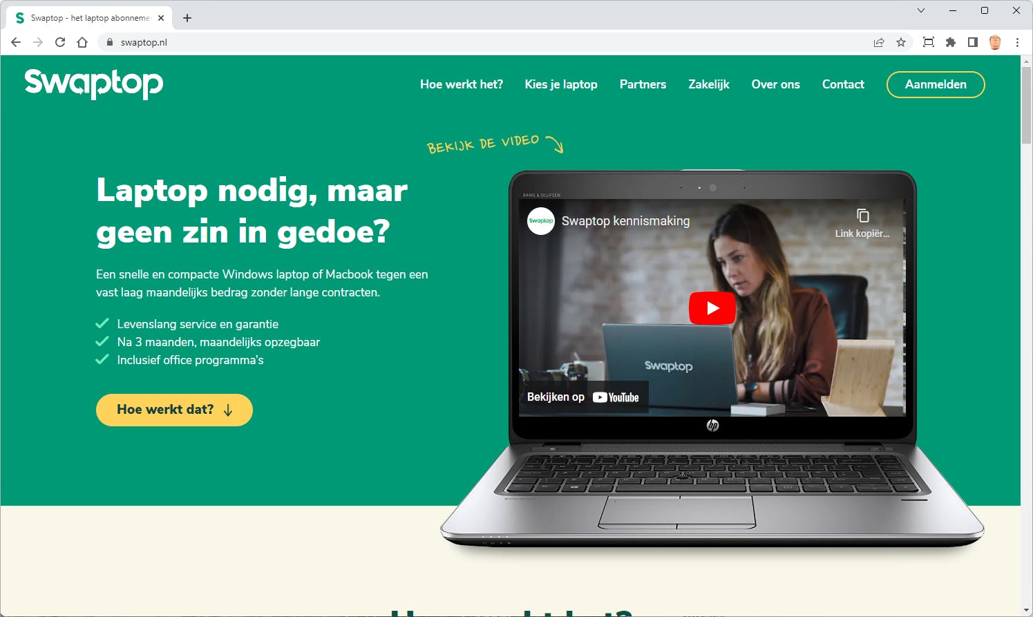 Een alternatief voor zelf kopen is leasen. Het Nederlandse Swaptop verhuurt HP en Apple-laptops aan zowel particulieren als bedrijven. Voor een vast maandbedrag krijg je de beschikking over een laptop met levenslange service en garantie. Het abonnement is na drie maanden, maandelijks opzegbaar.
