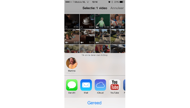 Hier zie je de iPad verschijnen onder het kopje AirDrop (zorg wel eerst dat de iPad aan is en niet stand-by). Selecteer vervolgens het pictogram van het apparaat waar je mee wilt delen. Op de iPad wordt nu gevraagd of je de overdracht wilt accepteren, waarop je uiteraard positief antwoordt. De video wordt nu overgezet en verschijnt tussen je mediabestanden alsof de video op de iPad zelf was geschoten.