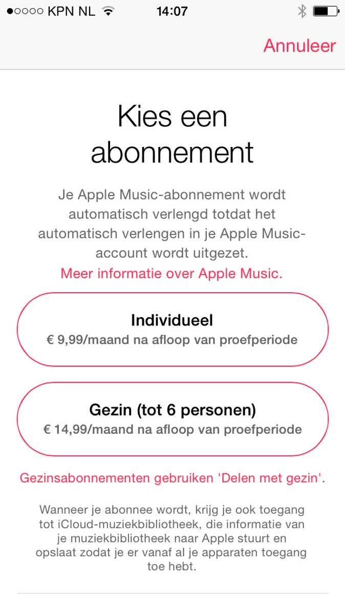 Voordat je Apple Music kunt gebruiken moet je het type abonnement kiezen. Wanneer je op het hartvormige icoontje hebt gedrukt verschijnen twee abonnementstypes waar je een keuze uit kunt maken. De eerste optie is een individueel abonnement voor 9.99 euro per maand (na de proefperiode.) De proefperiode duurt drie maanden en hierin kan er gratis gebruik worden gemaakt van Apple Music.