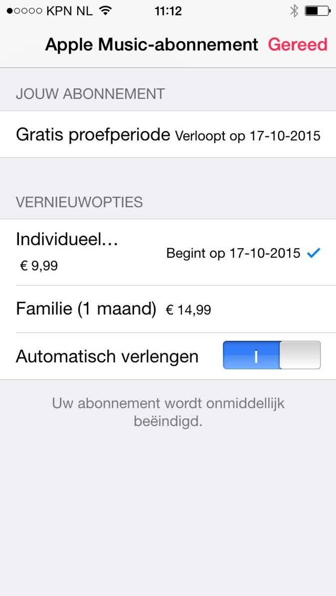 Na de proefperiode wordt het abonnement automatisch omgezet naar een betaalabonnement. Wanneer je hier geen interesse in hebt kun je dit eventueel voorkomen. Linksboven in Apple Music zie je het profiel icoontje in in het scherm. Zodra je deze aantikt kom je in het abonnementsgedeelte van Apple Music. Vervolgens klik je op Bekijk Apple ID. Nadat je bent ingelogd met je Apple ID is in het blauw het woord Beheer te zien. Als je beheer opent zie je direct wanneer jouw proefabonnement afloopt en kan je de automatische verlenging uitzetten. Het abonnement zal dan na de proefperiode komen te vervallen. Deze zet je uit door de 'schuifknop' naar links te verschuiven. Er volgt een directe bevestiging in je scherm voor het beëindigen van het abonnement na de proefperiode