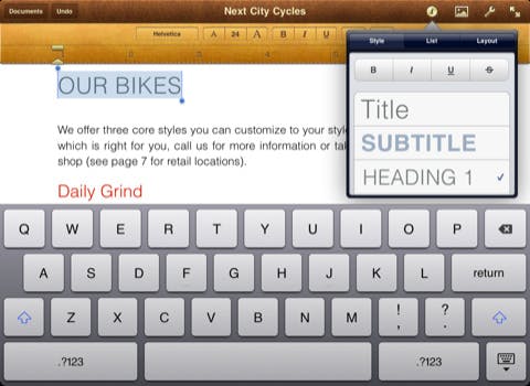 Ook is het mogelijk een nieuw document aan te maken, waarbij je met behulp van het digitale toetsenbord tekst kunt schrijven. Nadat je een tekst hebt geschreven kun je deze gaan opmaken. Je kunt hiervoor onder andere gebruik maken van de mediakiezer, waarmee je foto's en video's uit de app Foto's kunt toevoegen.