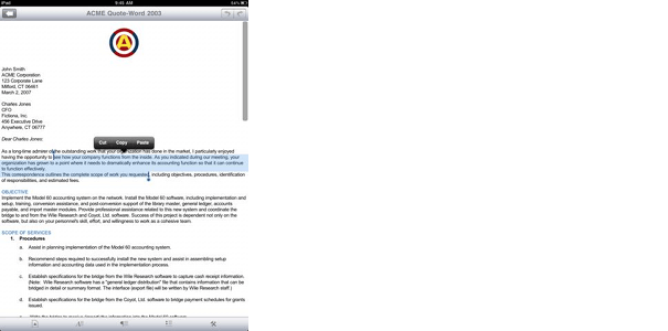 Documents To Go is een alternatief voor Pages van de appontwikkelaar DataViz waarmee je onder andere PDF-, iWork-, txt-, rtf-, Word- (zowel .doc als .docx), Excel- en PowerPoint-bestanden kunt openen. De app biedt alle standaardfunctionaliteiten die je van een Office-pakket mag verwachten, maar bevat ook een aantal extra's.