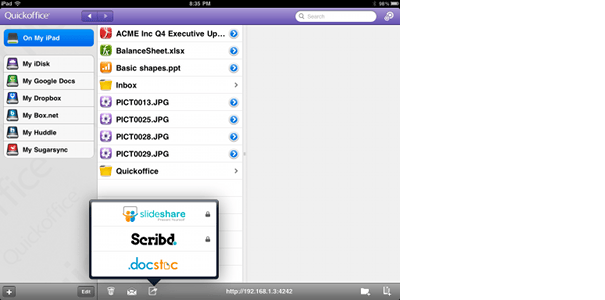 Quickoffice Pro HD biedt je de mogelijkheid bestanden te bewerken vanuit clouddiensten als Dropbox