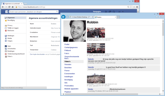 Open je Facebook, klik op het pijltje naar beneden en kies Instellingen / Algemeen. Klik op Een kopie downloaden en volg de instructiestappen. Het archief wordt geleverd met een index.htm-bestand. Dit bestand kun je openen in je webbrowser. Je ziet alle berichten die je ooit hebt gestuurd, foto's en video's en de apps die gegevens naar Facebook hebben gestuurd. Uiteraard zie je je vriendenlijst en welke vrienden je zijn ontvallen. Neem vooral een kijkje bij Adv en probeer niet te schrikken. Hier ze je hoe Facebook jou in steekwoorden heeft 'ingedeeld' voor adverteerders, want daar gaat het ten slotte om: geld verdienen.