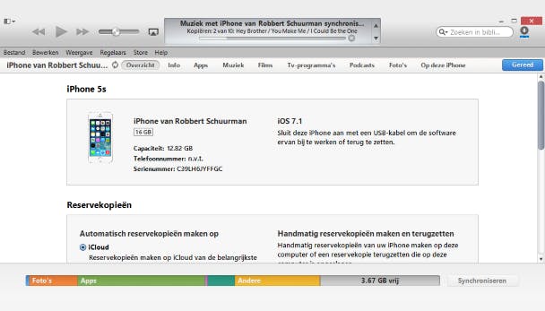Het kan zijn dat de synchronisatie niet werkt. Probeer dan eerst te kijken of wifi is ingeschakeld en het apparaat zich in hetzelfde netwerk als de computer bevindt. Is dit zo, sluit iTunes dan een keer af en probeer het opnieuw. Werkt het nog niet, kijk dan of de computer is gemachtigd door op Store te klikken en te kiezen voor Machtig deze computer. Probeer dan het apparaat nog een keer te synchroniseren via een usb-verbinding. Start na het synchroniseren de computer opnieuw, sluit het iOS-apparaat aan op een adapter of probeer het opnieuw via de instellingen van je iOS-apparaat.