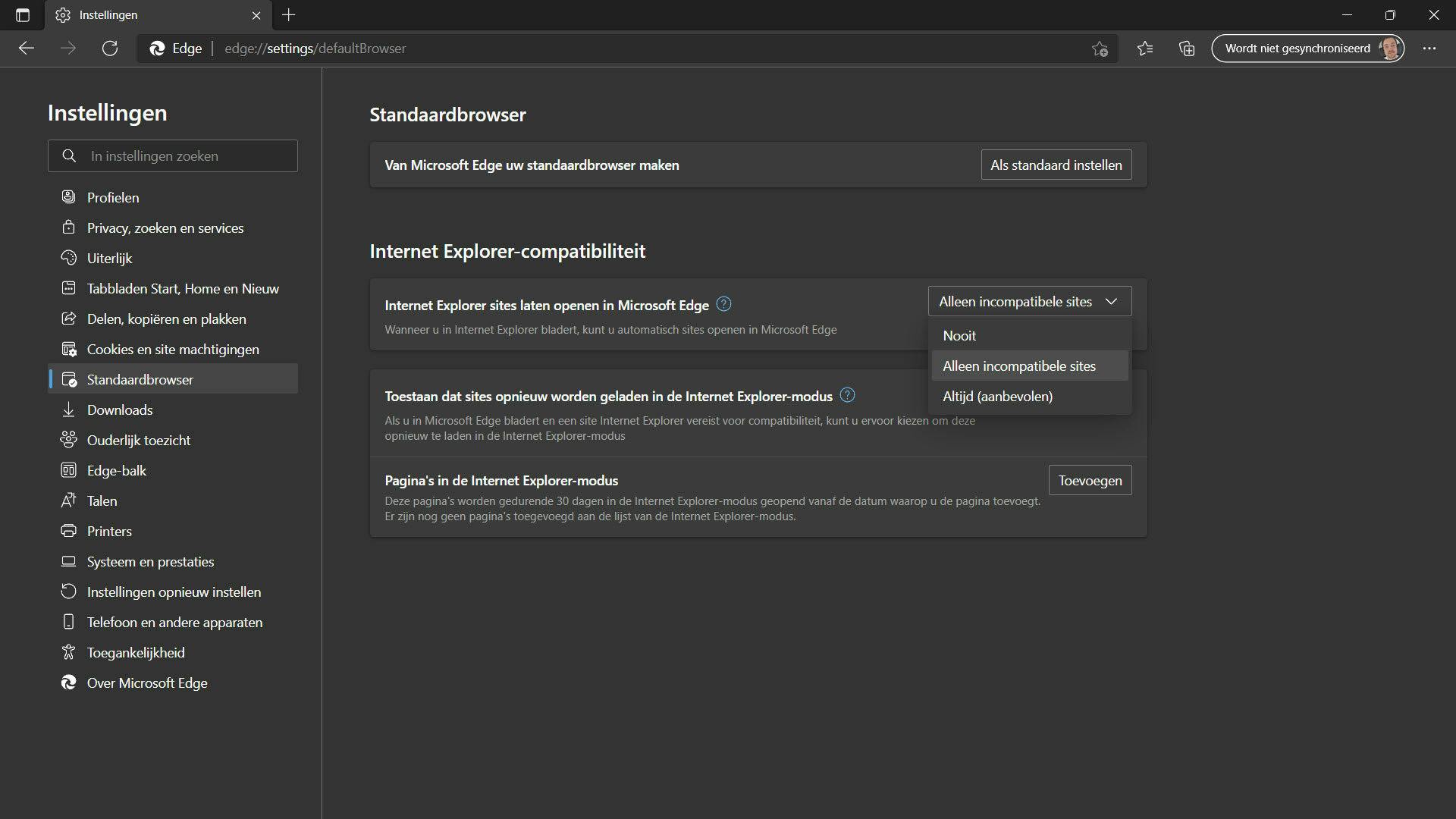 Op deze pagina zie je heel groot Internet Explorer-compatibiliteit staan. Daaronder staat de optie Internet Explorer sites laten openen in Microsoft Edge. De standaardoptie staat op Alleen incompatibele sites. Klik op het dropdownmenu rechts en selecteer de optie Altijd (aanbevolen).