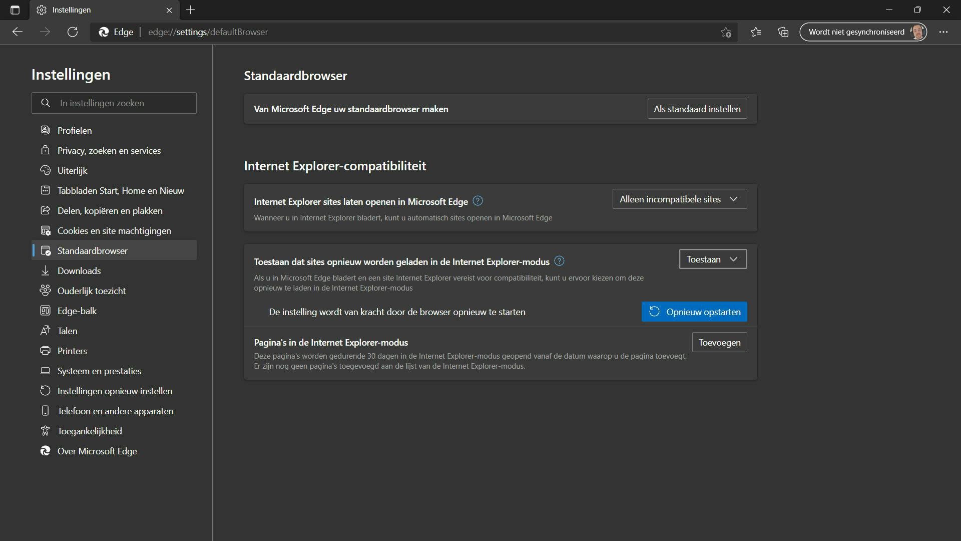 Om de instellingen op te slaan, dien je de Edge-browser even opnieuw op te starten. Onthoud dat wanneer je hier iets aanpast, je er níet voor zorgt dat Microsoft Edge of Internet Explorer ineens je standaardbrowsers zijn. Wat je hier aanpast, is dat websites die geoptimaliseerd zijn voor Internet Explorer in de Internet Explorer-modus geopend worden.