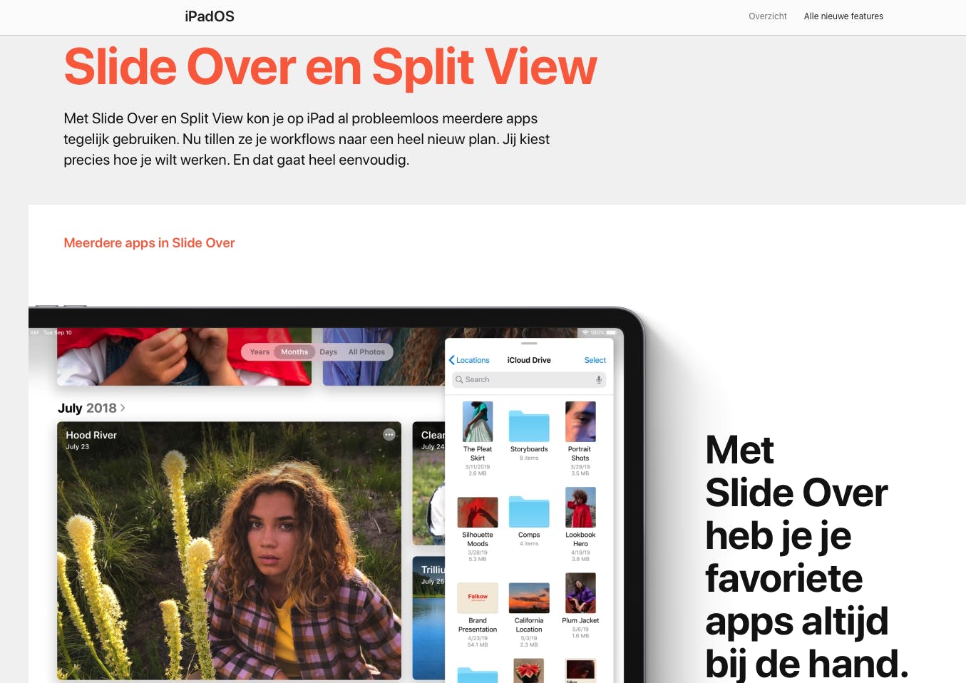 Zo kun je met Multitasking gemakkelijker twee of meer applicaties tegelijkertijd gebruiken. Safari toont bovendien standaard desktopversies van websites in plaats van mobiele versies. En iPadOS kan data lezen en schrijven van externe media, zoals ssd-schijven en flashdrives.