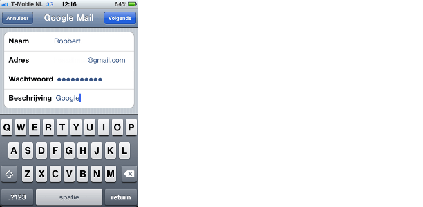 Log in op uw iPhone. Ga naar Instellingen / Mail, Contacten, Agenda en druk op Voeg account toe. Kies Google Mail en vul de juiste gegevens in.