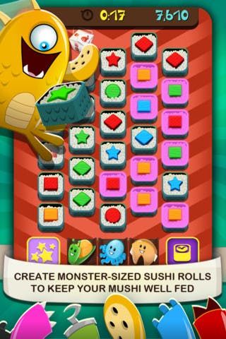 Sushi Mushi is een spannende multiplayer game waarin je op een een speelveld met verschillende figuurtjes in vier kleuren combinaties moet maken. De game speel je op een strikt tijdslimiet waardoor Sushi Mushi een behoorlijk snelle game is.