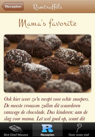 Met Sint Chef wordt dit nu wel heel eenvoudig. In deze app zijn namelijk tientallen verschillende Sinterklaasrecepten opgenomen. De recepten zijn zowel in moeilijkheid als smaak erg uiteenlopend waardoor je gegarandeerd uren plezier in de keuken kunt hebben met Sint Chef. Naast recepten biedt de app ook een sectie met nieuwsberichten over de app en de recepten. Het doel van deze berichten is echter niet helemaal duidelijk aangezien ze weinig toevoegen aan de app.