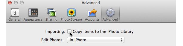De wijze waarop iPhoto ’11 hier momenteel mee omgaat, is ingewikkeld en beperkt. De app biedt wel een voorkeursinstelling om alleen naar afbeeldingen te linken in plaats van foto’s naar je iPhoto Library te kopiëren. Dit is één enkel bestand waarin alles wordt opgeslagen. Deze voorkeursinstelling geldt echter alleen voor foto’s die vanaf de schijf geïmporteerd worden; afbeeldingen die je via de camera of geheugenkaart importeert worden automatisch in de iPhoto Library opgeslagen.