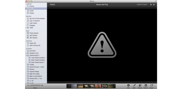 Als ik de externe schijf loskoppel kan ik nog steeds thumbnails zien van de foto’s die staan opgeslagen. Maar wanneer ik een foto probeer te openen – om deze beter te bekijken – laat iPhoto een dialoogvenster zien om te proberen het bestand te lokaliseren. Als je op Cancel klikt, krijg je een enorme zwarte afbeelding te zien met een waarschuwingssymbool in het midden.