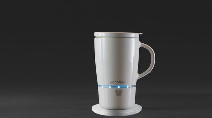 De draadloze warmtemok van Nanoheat zorgt ervoor dat je koffie, thee of andere warme drank drie kwartier lang op dezelfde temperatuur blijft. Zo hoef je nooit meer koude koffie weg te gooien of - de horror - koude koffie op te drinken. Voor 34 dollar heb je er al eentje in huis, en je kunt nog kiezen voor met of zonder oor ook.