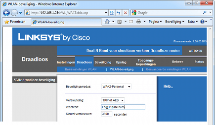 Een draadloos netwerk moet worden beveiligd en daarvoor is er de beveiligingsmodus. Die modus moet inmiddels toch echt op WPA2 staan. Probeer apparaten die deze standaard niet ondersteunen te voorzien van nieuwe firmware die WPA2 hopelijk toevoegt, en overweeg anders om het betreffende apparaat te vervangen. Gebruik TKIP- of AES-versleuteling en een goed wachtwoord. Maak een wachtwoord met speciale tekens en hoofd- en kleine letters aan, maar houd er rekening dat u het ook in zult moeten voeren op apparatuur die niet over een toetsenbord beschikt. Maak het om praktische redenen dus ook weer niet al te moeilijk.