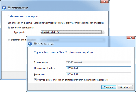 Om af te drukken op de netwerkprinter gebruikt u de software die met de printer wordt meegeleverd, of een nieuwere versie die vaak op de website van de maker van de printer kan worden gedownload. Als de installatiesoftware er de mogelijkheid toe geeft, kiest u voor Een lokale printer toevoegen. Klik vervolgens op Een nieuwe poort maken en kies bij Type poort voor Standard TCP/IP Port. Geef in het volgende venster het IP-adres van de printer op als hostnaam of als IP-adres. De poortnaam wordt dan ook automatisch aangepast.