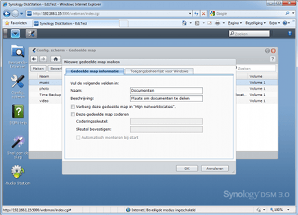Om een map te delen op een NAS moet die map eerst worden aangemaakt. Klik op Gedeelde map, Maken. Geef een naam voor de map en een Beschrijving. Klik vervolgens op Toegangsbeheerlijst en selecteer dat iedereen Volledig beheer heeft. Als u nu op OK klikt, wordt de map aangemaakt. Eventueel kunt u achteraf nog aanvullende rechten instellen. Om vanaf een pc in het netwerk bestanden in de aangemaakte map op te kunnen opslaan, opent u Windows Verkenner en klikt u met de rechtermuisknop op Netwerk, Netwerkverbinding maken. Selecteer de stationsletter die u binnen Verkenner wilt gaan gebruiken en voer daarna bij Map het netwerkadres in van de gedeelde map. Dat adres bestaat uit \\ (dubbele backslash) gevolgd door het IP-adres van de NAS, vervolgens een \ (enkele backslash) en daarna de naam van de gedeelde map. Laat het vinkje bij Opnieuw verbinding maken bij aanmelden staan en klik op Voltooien. Als er nu een loginscherm verschijnt, betekent het dat de rechten nog niet goed zijn ingesteld.