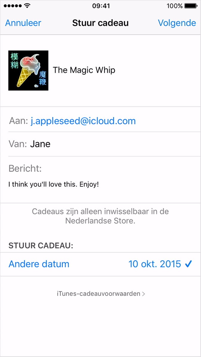 Standaard wordt het cadeau op de dag van aankoop verzonden, maar als je op de datum in het menu Stuur cadeau drukt, kun je deze aanpassen (met een venster van 90 dagen). Het cadeau wordt op die datum als e-mail link naar de ontvanger gestuurd. In het volgende scherm kun je de stijl van de e-mail kiezen, zodat hij er mooi uit komt te zien. Druk op Volgende om akkoord te gaan. Vervolgens kun je alles nog een keer controleren voordat je de aankoop daadwerkelijk doet.
