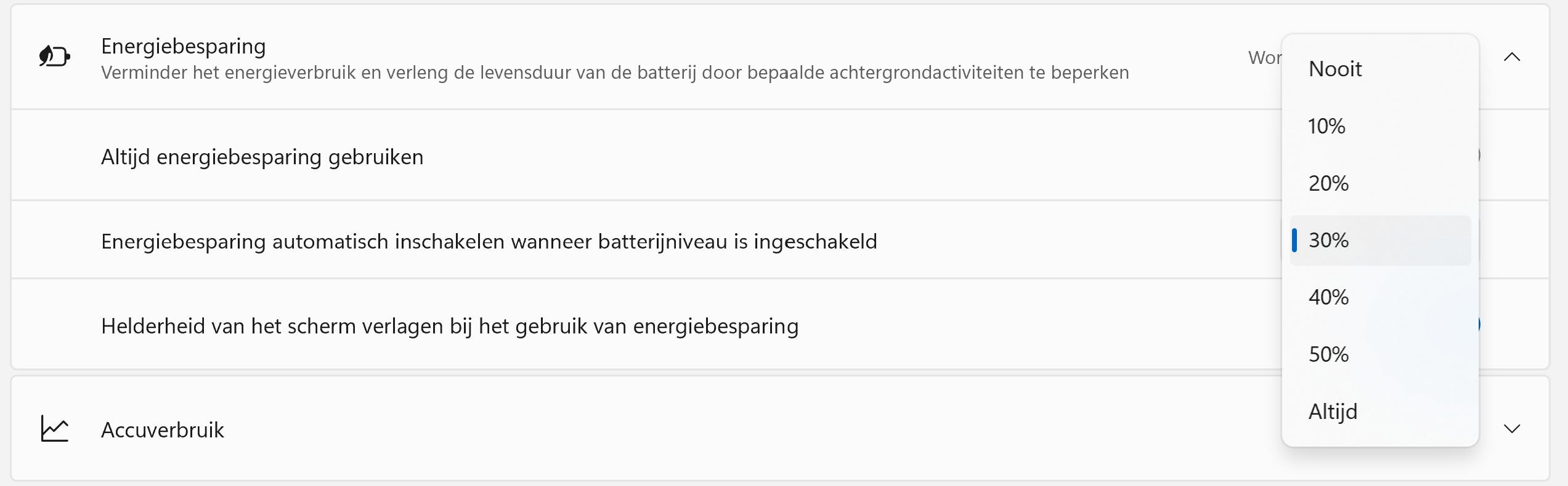 Voor Windows 11 kies je in het instellingenvenster voor Systeem / Aan/uit en accu. Klap de sectie Energiebesparing uit. Zet een vinkje bij Altijd energiebesparing gebruiken en geef in het vak eronder aan bij welk batterijpercentage dit gebeurt, bijvoorbeeld 20%. Activeer ook de optie Helderheid van het scherm verlagen bij het gebruik van energiebesparing.