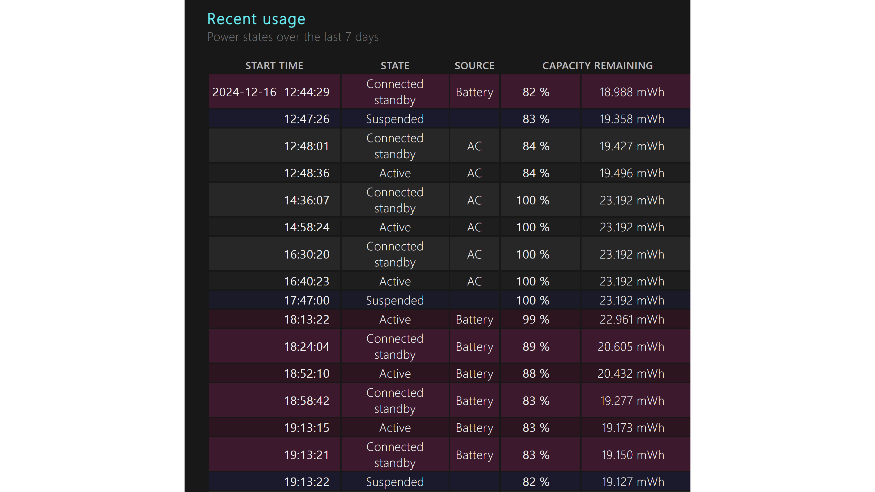 De grafiek en de tabel eronder tonen hoe de batterijlading is afgenomen in de afgelopen zeven dagen. In de tabel Usage History lees je de verhouding af tussen het gebruik van de accu en het gebruik van het stroomnet.