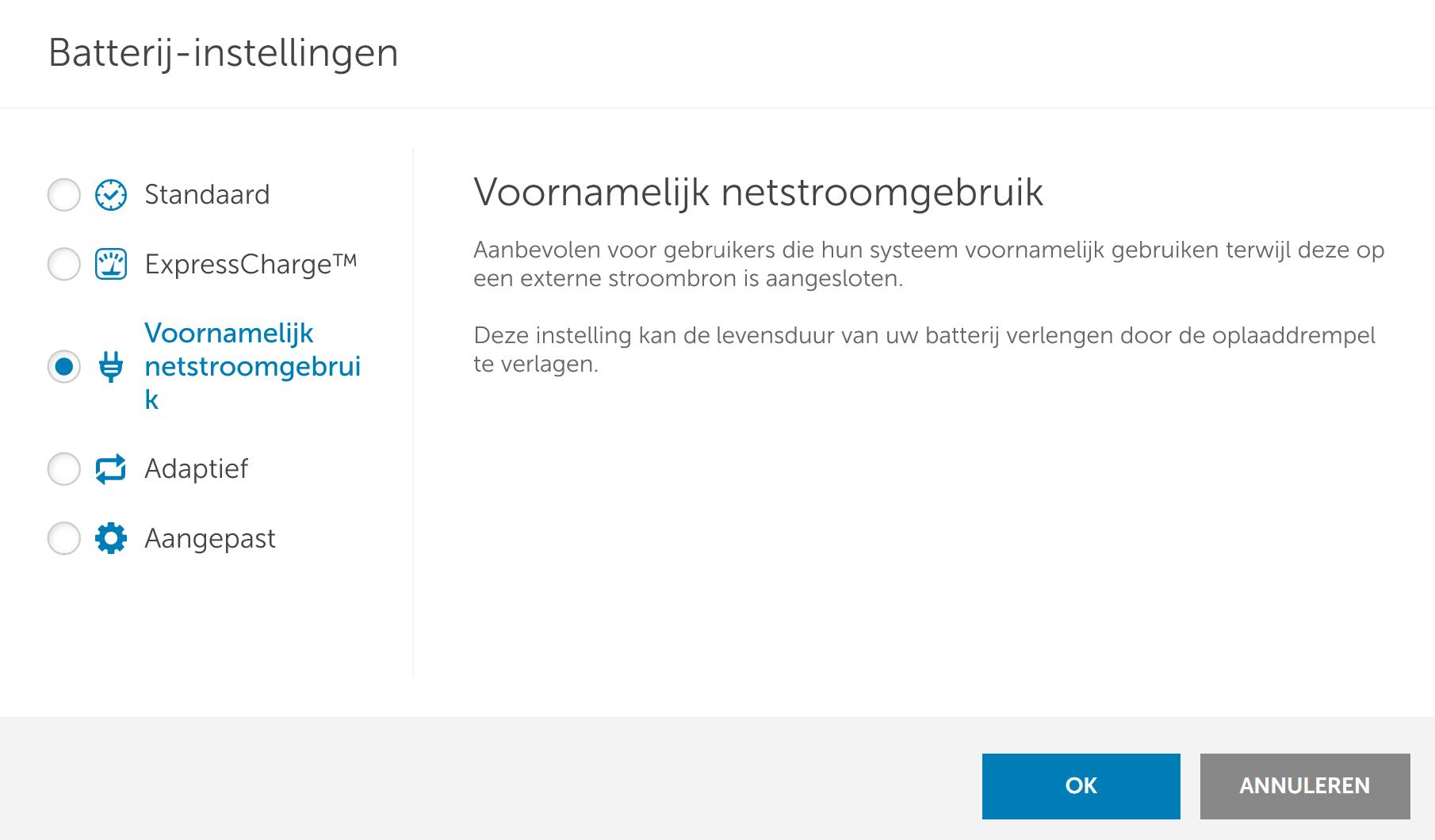 Op basis van het gebruikersprofiel past de app de batterij-instellingen aan. Zo kun je bijvoorbeeld aangeven dat je de laptop grotendeels met stekker gebruikt. De app stelt de accu dan in dat deze niet boven de 80 procent of 85 procent wordt opgeladen. Heb je juist altijd alle capaciteit nodig, dan kies je ervoor om de accu altijd voor de volle 100 procent op te laden.