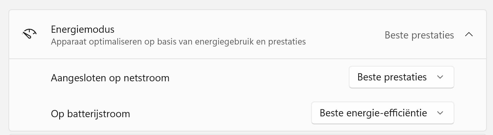 Met een energiebeheerschema bepaal je hoe Windows omgaat met de accu. Een bekend energiebeheerschema is het besparingsschema. Klik in Windows Taakbalk op de batterij en kies voor Energiebesparing. Er bestaan meerdere standaardschema’s. In de Windows-instellingen kies je Systeem Aan/uit en accu. Kies het schema bij Energiemodus: Windows maakt onderscheid tussen Aangesloten op netstroom en Op batterijstroom. Voor het beste uithoudingsvermogen kies je voor Beste energie-efficiëntie.