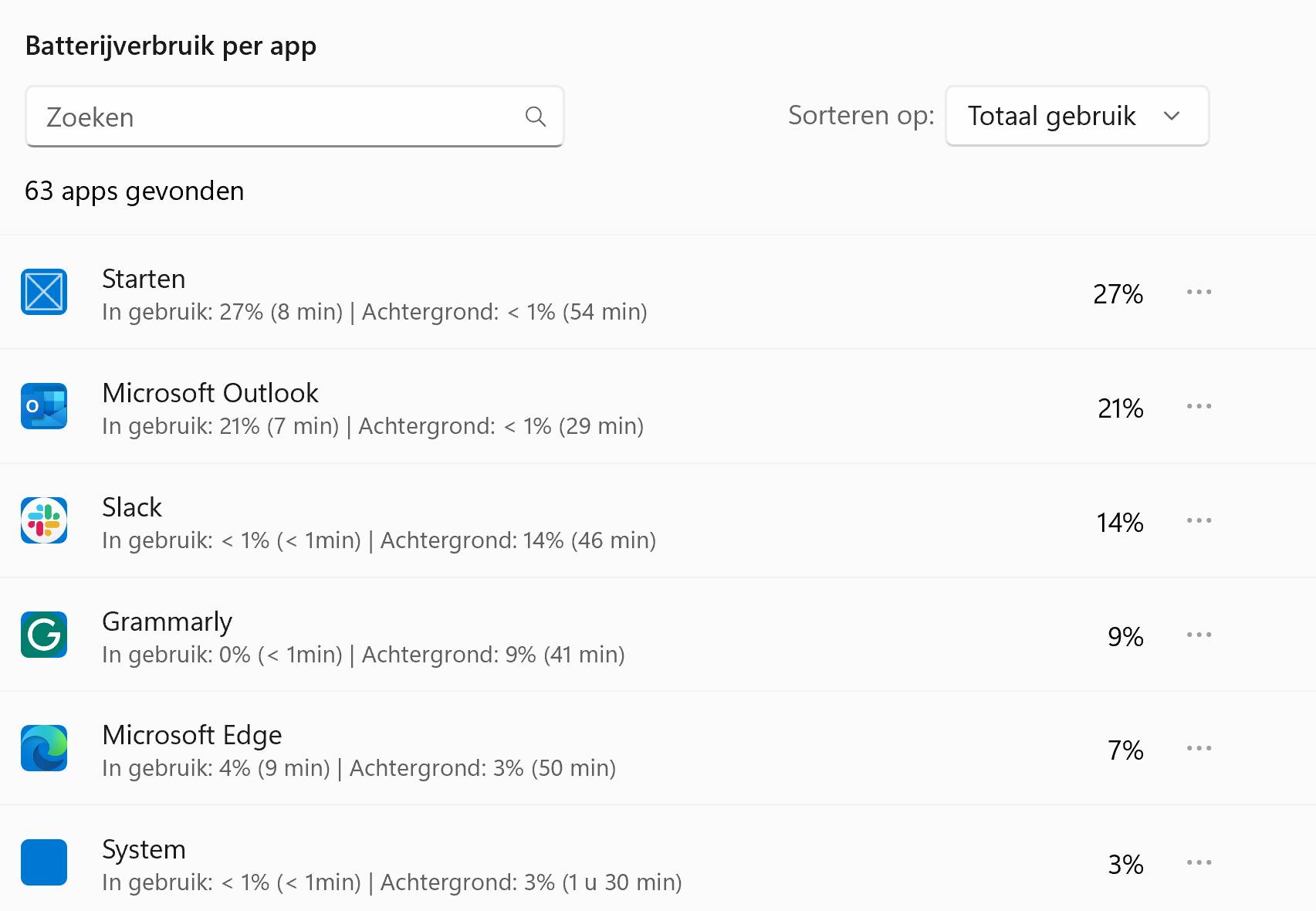 Rechtsboven vind je het filter Sorteren op. Standaard toont Windows het totale gebruik, maar interessanter is de optie Op achtergrond. Hiermee zie je welke apps op de achtergrond energie verbruiken.