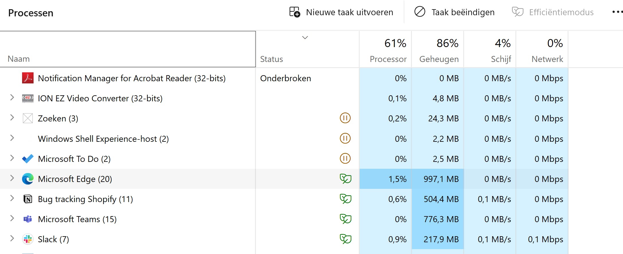 Via taakbeheer kun je de efficiëntiemodus ook afdwingen voor een programma. Klik op het betreffende programma. De knop Efficiëntiemodus rechtsboven verschijnt: klik hierop en kies OK in het bevestigingsvenster.