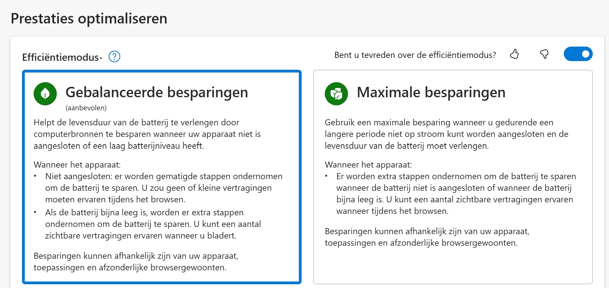 Standaard gebruikt Edge de modus Gebalanceerde besparingen. Wil je voor maximaal resultaat gaan, dan kies je voor Maximale besparingen. De modus wordt alleen gebruikt wanneer de laptop gebruikmaakt van een accu, maar je kunt de modus ook gebruiken als je een stekker gebruikt: kies De efficiëntiemodus inschakelen wanneer deze is aangesloten op netstroom.
