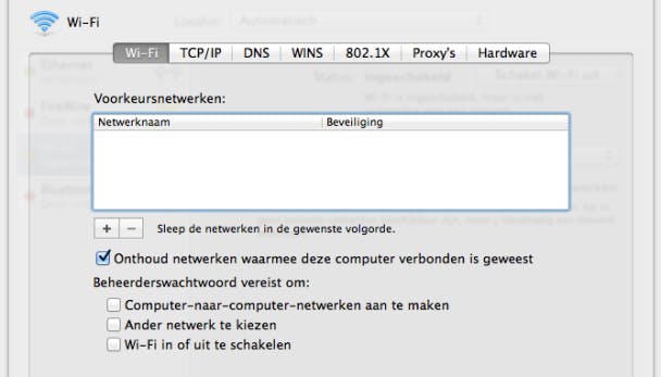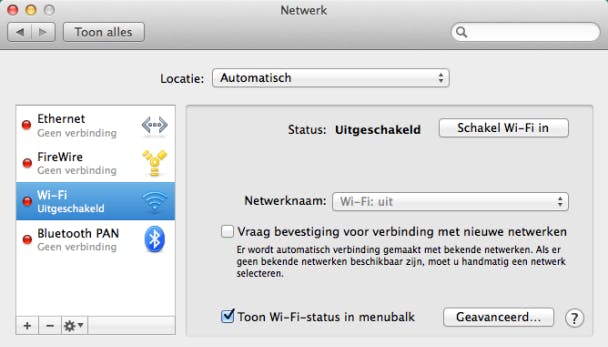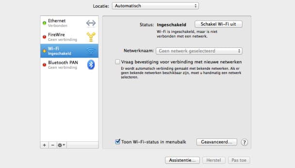 Voor nu moet hij uit staan. Start daarna de Mac of MacBook in kwestie en klik op het Apple-logo linksboven in beeld en kies Systeemvoorkeuren. Open het onderdeel Netwerk en klik op Wi-Fi. Is de wifi-functie uitgeschakeld, klik dan op Schakel Wi-Fi in. Nu is de draadloze netwerkadapter actief, maar moet er nog verbinding gemaakt worden met het netwerk. Achter Netwerknaam staat nu nog Geen netwerk geselecteerd. Klik daarop en kies Verbind met ander netwerk. Ken je de naam van het netwerk, dan kun je die intypen, maar je kunt ook klikken op Toon netwerken.
