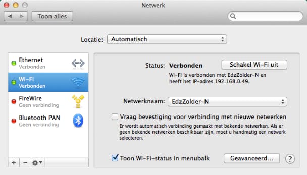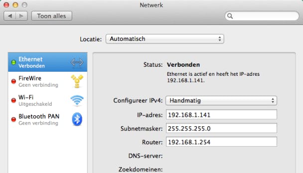 Er zijn veel verschillen tussen OS X- en Windows-systemen, behalve als het gaat om het netwerkprotocol. Zowel Windows als OS X gebruiken de absolute standaard, namelijk TCP/IP. Internettoegang wordt voor de meeste apparaten automatisch geregeld via DHCP. Om de netwerkconfiguratie te controleren en bijvoorbeeld het IP-adres van de Mac te weten, klik je in het onderdeel Netwerk op de netwerkverbinding.