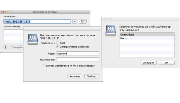 Start de Finder en klik bovenin op het menu Ga / Verbind met server. Typ in de regel bij Serveradres het commando smb:// gevolgd door het IP-adres van de NAS, dan weer een schuine streep en dan de naam van de gedeelde map (bijvoorbeeld smb://192.168.1.13/kopij). Daarna klik je op Verbind om de koppeling te maken. Even later opent de Finder de map op de NAS in een venster, en kun je bestanden uitwisselen door ze er gewoon heen te slepen.