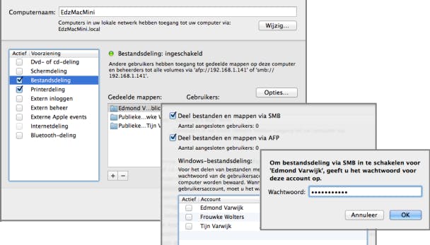 Klik op de knop Opties en controleer dat er een vinkje staat bij Deel bestanden en mappen via SMB. Zet vervolgens in het onderste deel van het scherm een vinkje bij de gebruikersnaam die je wilt gebruiken om de gedeelde map te openen. OS X opent een venster waarin je het wachtwoord van dat account moet typen. Klik daarna op OK en Gereed.