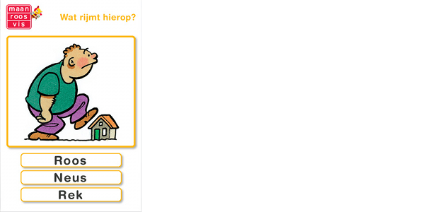 Maan Roos Vis is speciaal voor kinderen van groep 3 gemaakt. De app sluit dan ook aan bij de manier waarop ze leren lezen. Er zijn twee spelletjes: in 'Wat zie je?' kiezen de kinderen het juiste woord bij een afbeelding; in 'Waar rijmt het op' kiezen de kinderen woorden die rijmen. Maan Roos Vis is gratis te downloaden in de App Store.