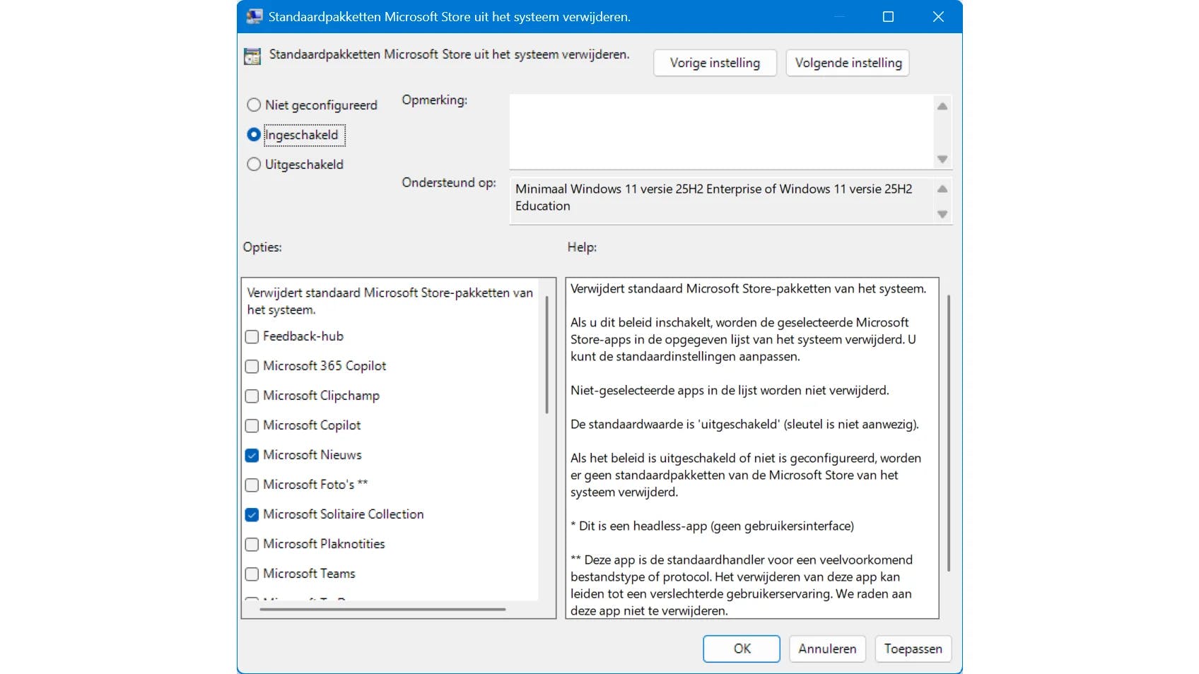 Ben je een gevorderde gebruiker en beschik je over Windows 11 Pro? Dan kun je ook het onderdeel Groepsbeleid slim gebruiken om Windows compact te maken. Open het venster Uitvoeren (Windows-toets+R) en typ Gpedit.msc. Vooral onder Computerconfiguratie / Beheersjablonen / Alle instellingen kun je flink wat opties aanpassen. Een interessante instelling is Standaardpakketten Microsoft Store uit het systeem verwijderen. Kies Ingeschakeld en zet aan de linkerzijde van het venster vinkjes bij de apps die je niet wilt gebruiken. Neem ook de rest van de categorie Windows-onderdelen door en zoek naar de standaardprogramma's (bijvoorbeeld Windows Agenda). Vaak kun je die individueel uitschakelen (bijvoorbeeld via Windows Agenda uitschakelen).