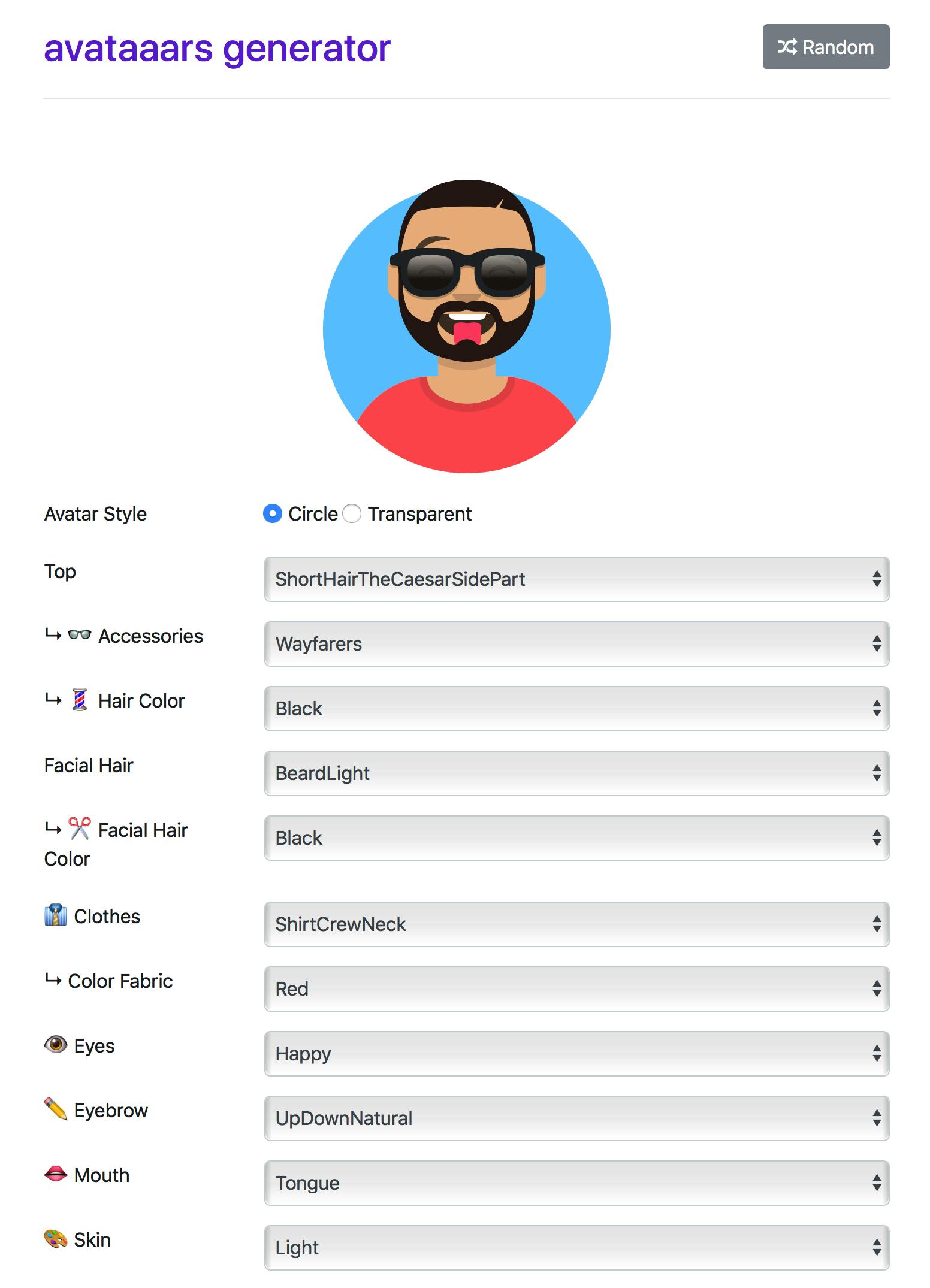 Probeer de knop Random enkele keren om een goed idee te krijgen van de leuke mogelijkheden van Avataaars Generator. Je kunt kiezen of je een poppetje maakt dat in een cirkelvormige achtergrond staat, of toch liever een transparante achtergrond hebt. Er is geen mogelijkheid om tussen een mannelijk of vrouwelijk poppetje te kiezen. Zelfs het geslacht bepaal je simpelweg door de juiste elementen te selecteren. Hoe wil je het haar? Kies je een bril? Zo ja, welke stijl? Welke kleur mag het haar krijgen? Wil je een ‘moustache magnum’ of een ringbaardje. Werk gewoon van boven naar onder de keuzemogelijkheden af.