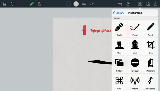Met tekst alleen maak je natuurlijk geen mooie infographic, daar heb je grafische elementen voor nodig. Die kun je zelf downloaden van internet, maar Grafio heeft er ook al een boel voor je verzameld. Je voegt een grafisch element toe door te drukken op het derde pictogram van rechts in de werkbalk bovenin, en vervolgens op een categorie die je wilt toevoegen (zoals Basic Shapes, Pictograms, Textables, enzovoort). Als je echt professioneel aan de slag wilt heb je meer beeld nodig, maar om te beginnen is dit prima.
