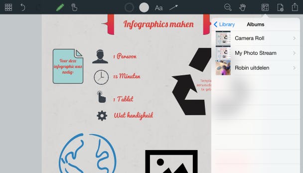 Als je niet tevreden bent met het beeld dat Grafio voor je heeft geselecteerd of je hebt nog iets anders nodig, dan kun je heel eenvoudig zelf beeld invoegen. Daarvoor moet je het beeld eerst op je iPad hebben gedownload of gesynchroniseerd. Zorg ervoor dat het beeld niet te groot is, anders ben je eerst drie minuten bezig met de knijpbeweging om het op het juiste formaat te krijgen. Druk rechtsboven op het derde pictogram van rechts en kies voor Photo library. Je kunt nu een foto uit je eigen bibliotheek selecteren.