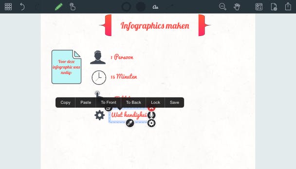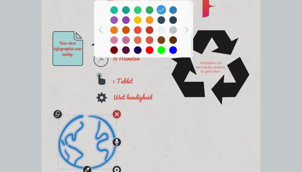 Of je nu foto's, tekst of pictogrammen hebt geplaatst in je infographic, of alle drie, de kans is nihil dat het er direct picobello uitziet. Oftewel, je zult de eigenschappen van de elementen wat moeten aanpassen. Druk je tweemaal op een element, dan kun je de grootte verslepen. Met de roteerbeweging van je vingers, kun je een element draaien. Druk je op het tandwiel (een snelkoppeling naar de knoppen bovenin), dan kun je lettertype, kleur, enzovoort aanpassen. Zo kun je het element helemaal naar je hand zetten. Met het kruisje verwijder je het element.