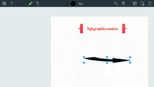 Wanneer je drukt op het derde pictogram van rechts en drukt op Arrows om een pijl in te voegen, zie je dat alle pijlen één richting op wijzen. Rechte pijlen kun je draaien, maar met ronde pijlen werkt dat niet, omdat je die soms de andere kant op gebogen wilt hebben. In dat geval druk je tweemaal op de pijl en sleep je de pijl kleiner, je gaat door totdat de pijl zich als het ware omdraait. Zo krijg je hem alsnog gebogen in de richting die je wilt.