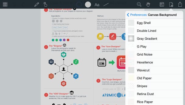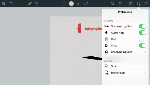 Naast de achtergrond vind je in het menu achter het tweede pictogram rechtsboven ook nog een keur aan andere opties. Ten eerste kun je de afmeting van je infographic aanpassen, maar je kunt ook voorkomen dat Grafio vormen herkent (wanneer je een cirkel tekent, maakt de app er automatisch een mooie cirkel van). Ook de uitlijnhulp kun je in dit menu uitzetten, maar dat raden we af, want die zorgen nu juist voor een mooi, strak document.