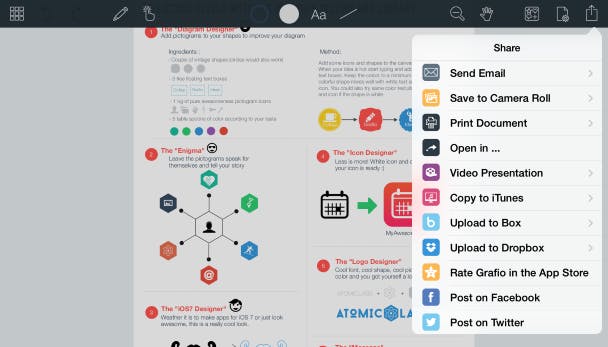 Wanneer je klaar bent met je infographic, wil je die waarschijnlijk delen met anderen. Dat kun je doen door op het pictogram Delen te drukken helemaal rechtsboven. Je krijgt een aanzienlijk aantal opties te zien. Onthoud echter wel, dat wanneer je de gratis versie van de app gebruikt, je infographics altijd voorzien zullen zijn van een logo van Grafio. Wil je die niet, dan moet je de betaalde versie van 8 euro aanschaffen. Je kunt je bestaande infographics dan overigens eenvoudig overzetten.