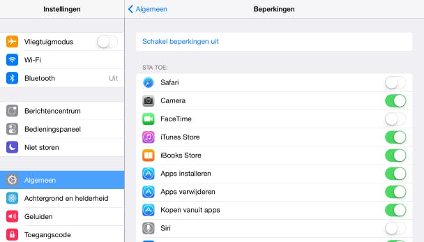 Dankzij de code kunnen kinderen dit soort aanpassingen niet zomaar maken. De beperkingen die je kunt opleggen zijn onderverdeeld in een aantal groepen. Zo kun je bij Sta toe een aantal standaardapps blokkeren. Zoals Safari, Camera, FaceTime, Siri en AirDrop. Als jouw kind niets op internet te zoeken heeft, is dat dus eenvoudig te regelen door Safari te blokkeren. Mag een kind geen foto's maken, dan blokkeer je hier in één klap beide ingebouwde camera's. De pictogrammen van de apps verdwijnen hiermee van het hoofdscherm. De apps zelf worden niet van het apparaat verwijderd, dus je kunt ze altijd weer snel en gemakkelijk beschikbaar maken.