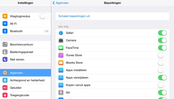 Een flink aantal standaardfuncties van de iPad kun je uitschakelen, zodat kinderen er geen gebruik van kunnen maken als ze er niets te zoeken hebben. Dit doe je via Instellingen / Algemeen / Beperkingen. Tik allereerst op Schakel beperkingen in. Dat hoeft maar eenmalig. Bedenk een toegangscode van vier cijfers. Die heb je elke keer nodig als je beperkingen wilt aanpassen.