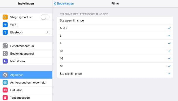 Niet alles wat je op een iPad kunt zien, horen, lezen en doen is geschikt voor kinderen van alle leeftijden. Via Instellingen / Algemeen / Beperkingen stel je bij onderdeel Toegestaan materiaal in welk materiaal aan kinderen beschikbaar mag worden gesteld. Je begint met de optie Leeftijdskeuring. Stel dit in op Nederland. Voor films en apps kies je vervolgens een leeftijdskeuring. Is jouw kind tien jaar, dan kies je bij Films voor 9 en bij Apps voor 9+. Je kunt zelfs alle apps of alle films blokkeren, maar dat is wel heel rigoureus. Bij Muziek en podcasts en bij Boeken geef je aan of expliciet materiaal afgespeeld en gelezen mag worden, terwijl je bij TV-programma's aangeeft of programma's met leeftijdskeuring zijn toegestaan. Mocht jouw kind handig zijn met een van de talen die Siri herkent, zoals Engels, dan kun je ook hier enkele beperkingen voor instellen.