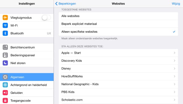 Via Voeg een website toe onder het kopje Sta nooit toe kun je daarom zelf extra websites blokkeren. Is een website naar jouw mening ten onrechte geblokkeerd, dan kun je die vrijgeven via Voeg een website toe onder het kopje Sta altijd toe. Zoals gezegd is deze methode zeker niet waterdicht. Er worden veel websites geblokkeerd, maar niet alles. Een iPad is het veiligst als je de zaken omdraait. Door alles te blokkeren behalve websites die jij opgeeft. Kies hiertoe de derde optie Alleen specifieke websites onder het kopje Toegestane websites en voeg de websites toe die bezocht mogen worden.