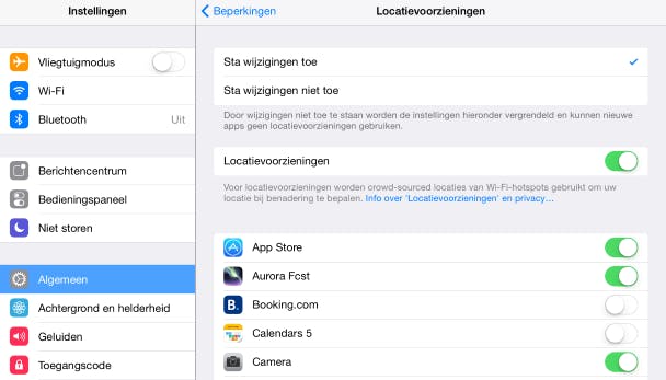 De exacte locatie waar je kind zich bevindt, wil je waarschijnlijk niet zomaar aan de grote klok hangen. Toch kunnen allerlei apps zomaar locatiegegevens op de iPad opvragen. Soms is dat best handig, maar zeker niet altijd noodzakelijk. Voor een app zoals Google Maps of Kaarten is het nuttig, omdat daarmee de huidige locatie op de kaart is te zien. Dit is een onschuldige toepassing. Voor een agenda-app of sociaal netwerk is het niet echt noodzakelijk om te weten waar je kind is. Je kunt zelf bepalen welke apps toegang hebben tot locatiegegevens via Instellingen / Algemeen / Beperkingen onder het kopje Privacy.